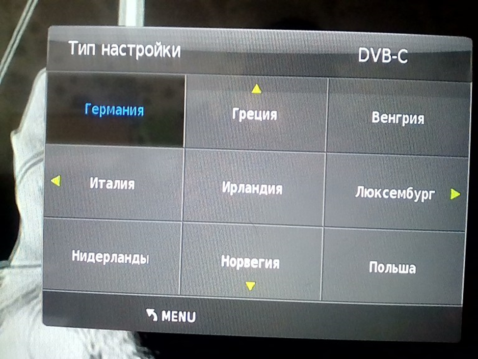 Тип настройки установите в значение «DVB-C». Тип каналов выберите ЦТВ, нажмите «ОК» на пульте. При запросе страны выберите Россию (в некоторых случаях может потребоваться выбрать Германию или Финляндию).